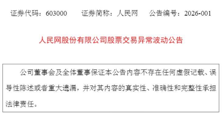 人民网股票于2026年1月5日至13日收盘价累计涨幅33.75%,其中1月12日、1月13日连续两个交易日内日收盘价格涨幅偏离值累计超过20%,并均以涨停价收盘。