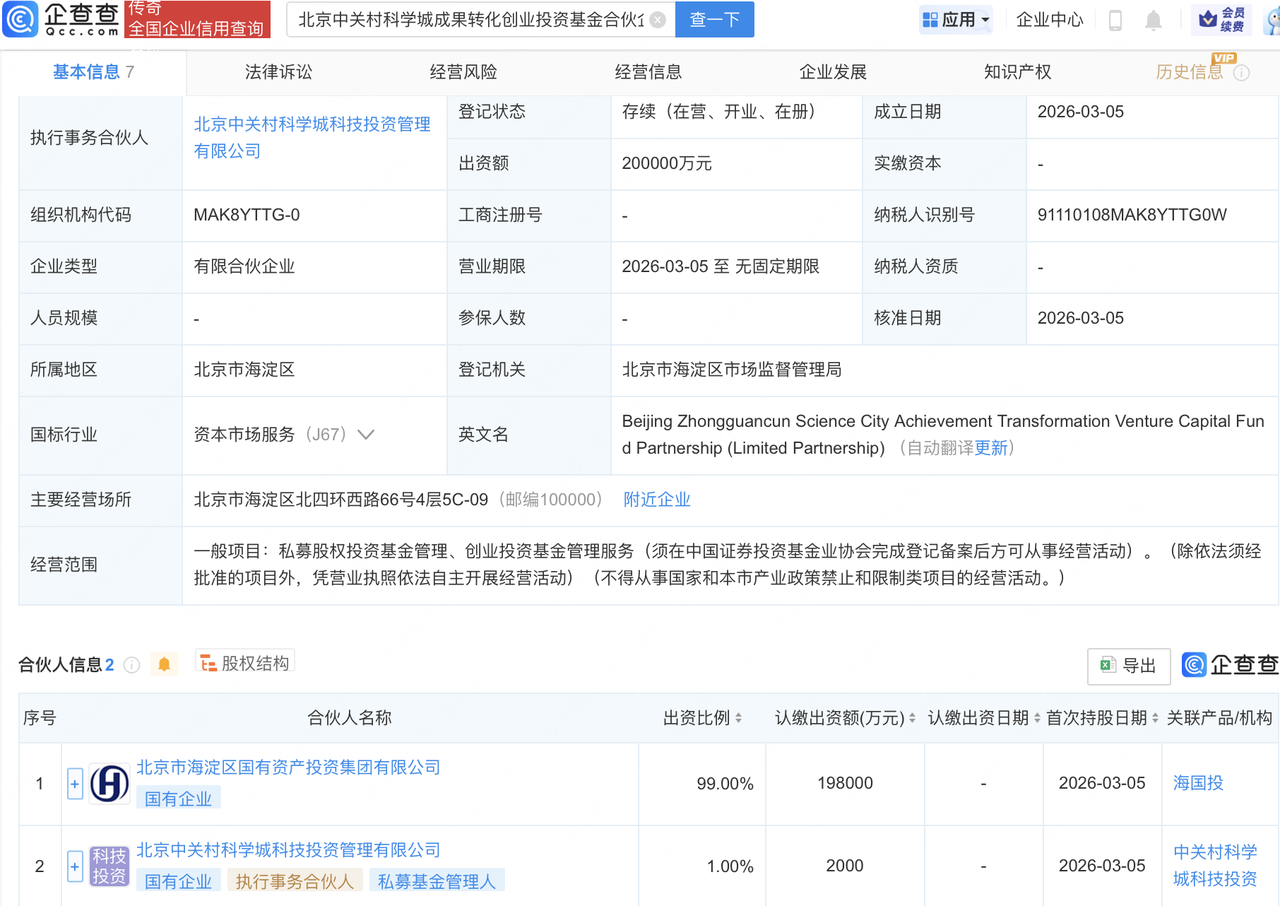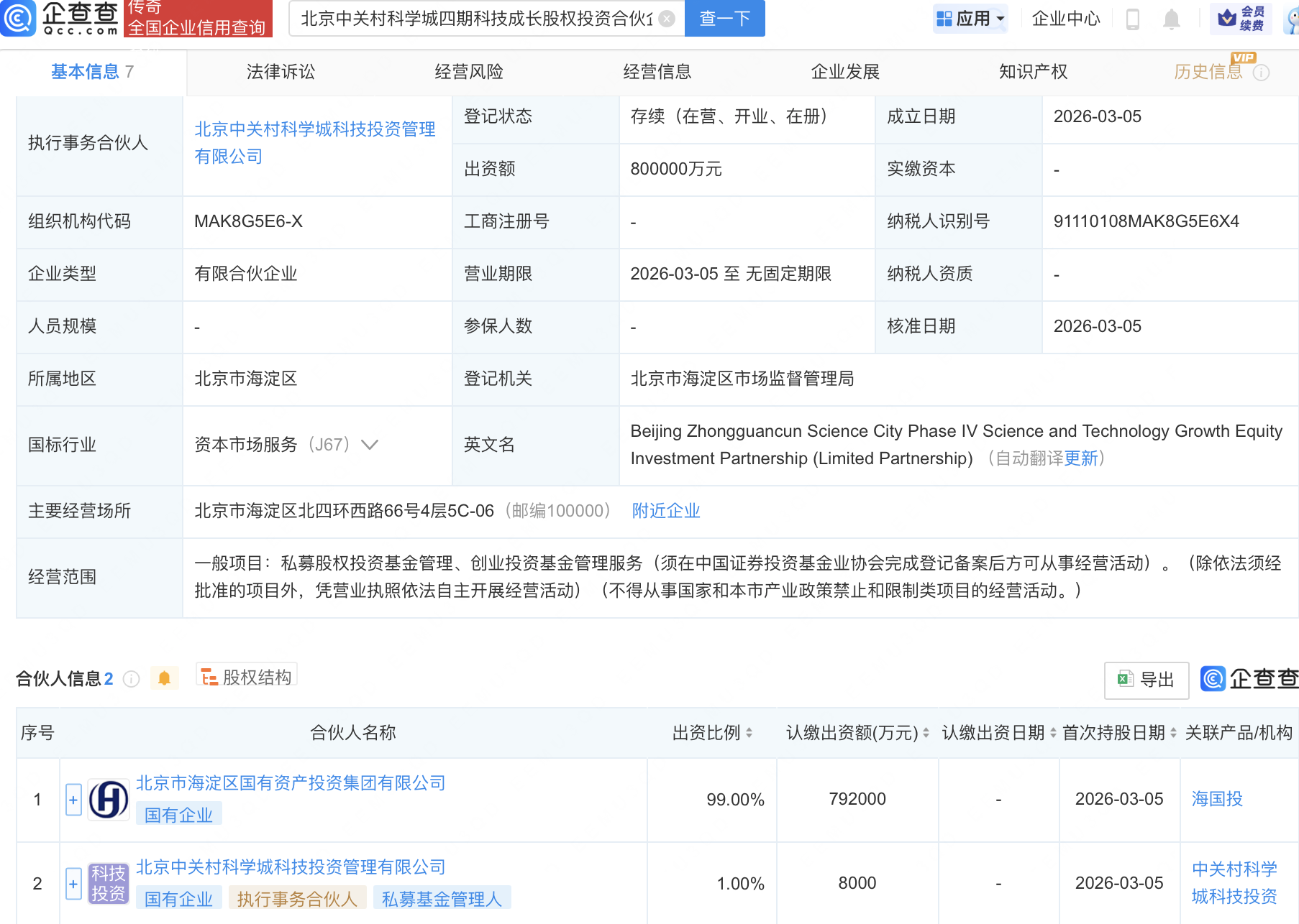 近日,北京中关村科学城成果转化创业投资基金合伙企业(有限合伙)、北京中关村科学城四期科技成长股权投资合伙企业(有限合伙)成立,出资额分别为20亿元、80亿元,经营范围均包含:私募股权投资基金管理、创业投资基金管理服务。企查查股权穿透显示,二者皆由北京市海淀区国有资产投资集团有限公司、北京中关村科学城科技投资管理有限公司共同出资。